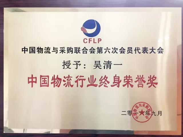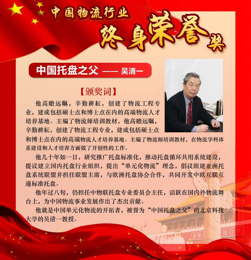 吳清一教授幾十年來為中國物流事業(yè)發(fā)展做出重大貢獻(xiàn),尤其在托盤物流領(lǐng)域取得了矚目的成就,經(jīng)中國物流與采購聯(lián)合會研究決定,授予吳清一教授“中國物流行業(yè)終身榮譽(yù)獎”。