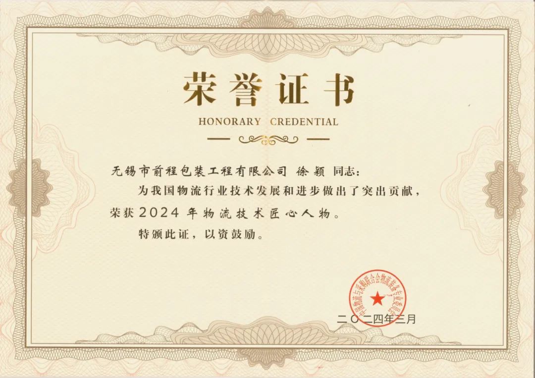 近年來,徐穎總經(jīng)理帶領技術研發(fā)團隊組建了江蘇省綠色智能包裝工程技術研究中心,并成功通過省級工程技術研究中心認定,對我國綠色智能包裝技術及企業(yè)創(chuàng)新發(fā)展注入新動力。通過開發(fā)新的代木材料,幫助客戶努力降低包裝成本,為客戶創(chuàng)造價值,為減少林業(yè)資源消耗及其他包裝原材料行業(yè)的可持續(xù)發(fā)展作出了積極的努力;通過推進循環(huán)包裝及減量化,為新能源、成套裝備、高端醫(yī)療器械等新興產(chǎn)業(yè)助力。公司獲得“創(chuàng)新示范領軍企業(yè)”、江蘇省“專精特新”企業(yè)等多項榮譽稱號,也收獲了眾多客戶的認可和信任。此次,徐穎總經(jīng)理榮獲”物流技術匠心獎”亦是行業(yè)對前程公司不斷創(chuàng)新、穩(wěn)健發(fā)展的高度肯定。
